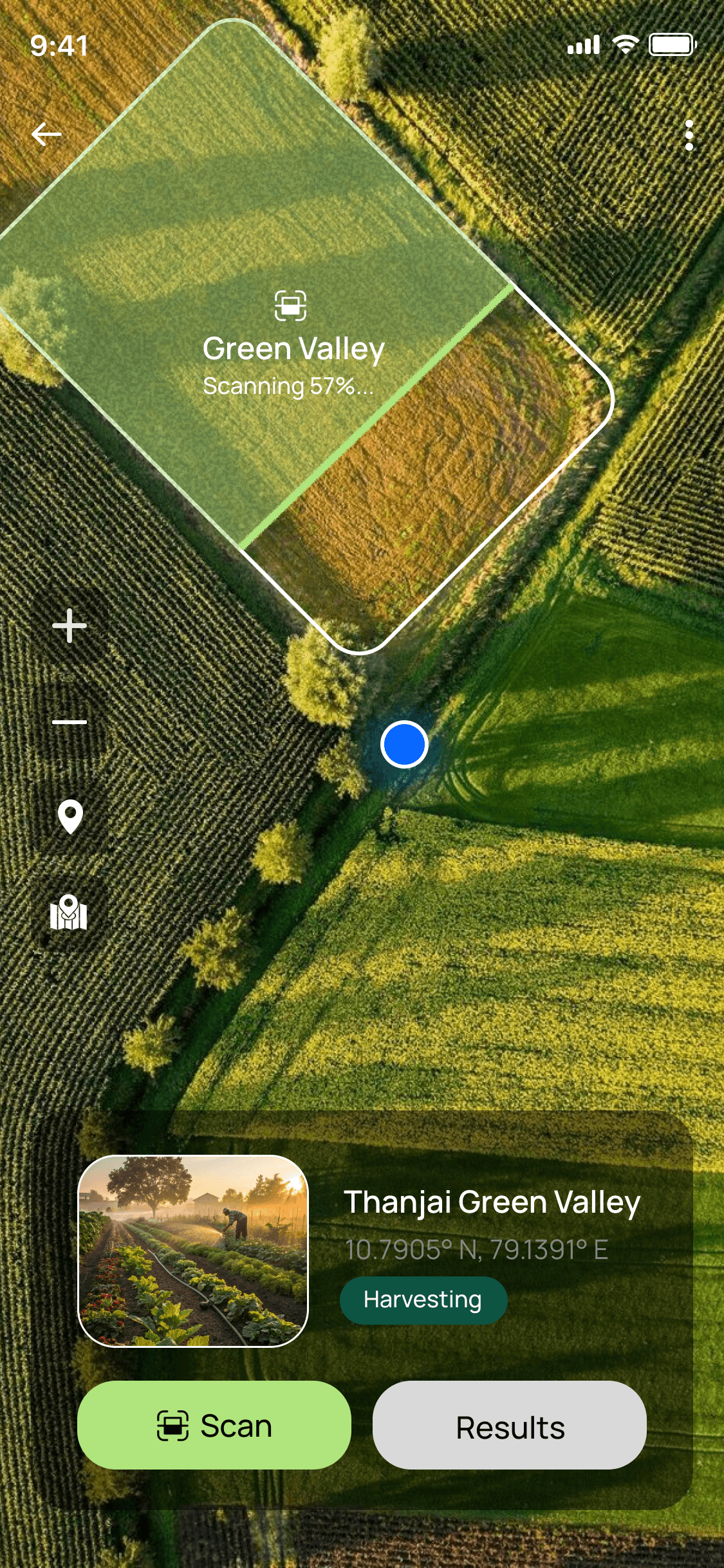 Farm Page Visual: This page brings fields to life with a top-down drone-style live map (Google Maps-like), current location pin for orientation, zoom controls for detail, navigation buttons to switch fields, and "Scan Results" for insights. UX Thinking: Visual over text lists for intuitive scanning; mimics real drones to feel innovative yet familiar.