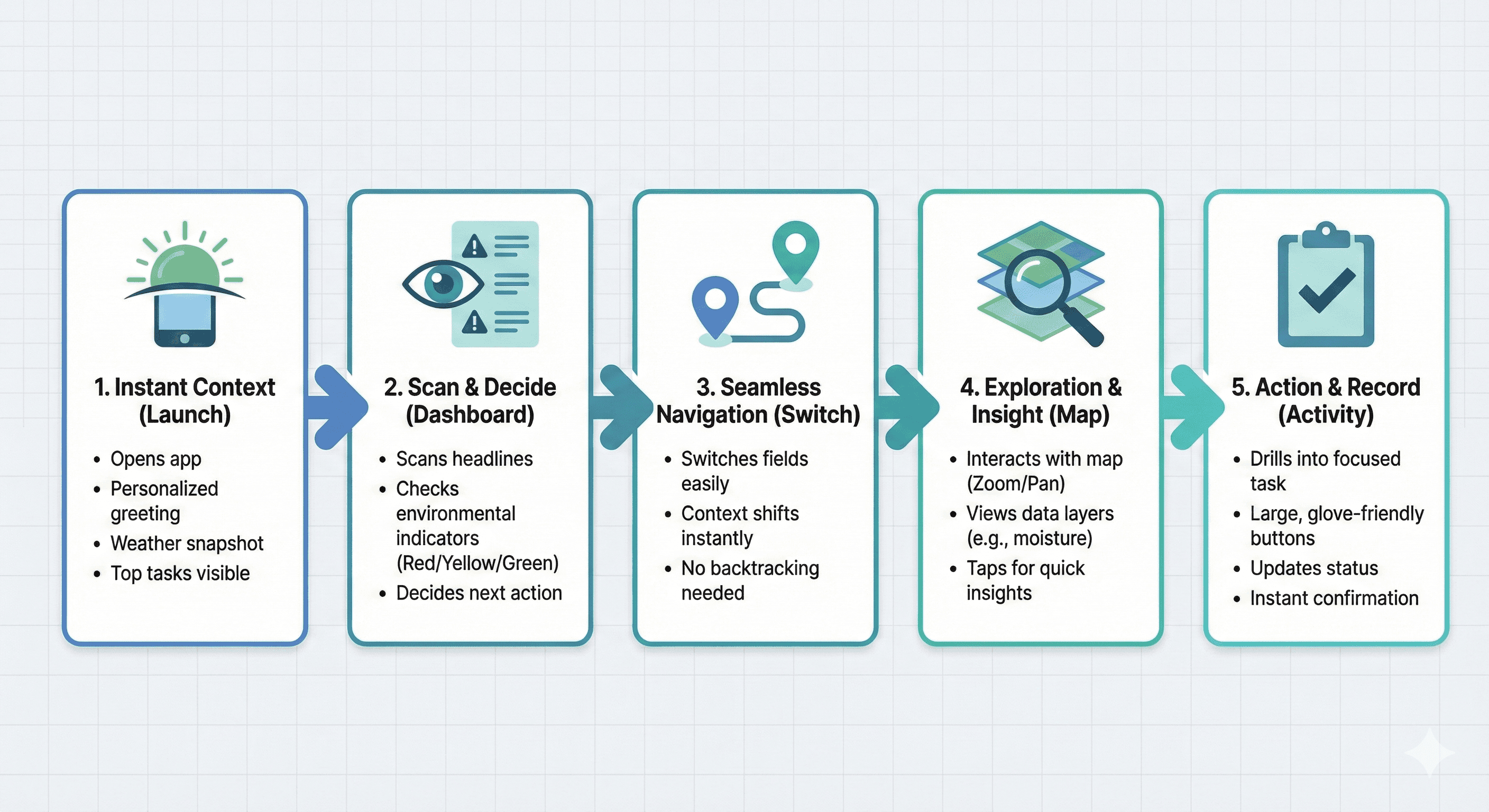 User Needs: Location-based insights for precise field navigation; simple, visible environmental indicators to avoid surprises; minimal learning curve with familiar gestures and large touch targets for gloved hands or outdoor use.