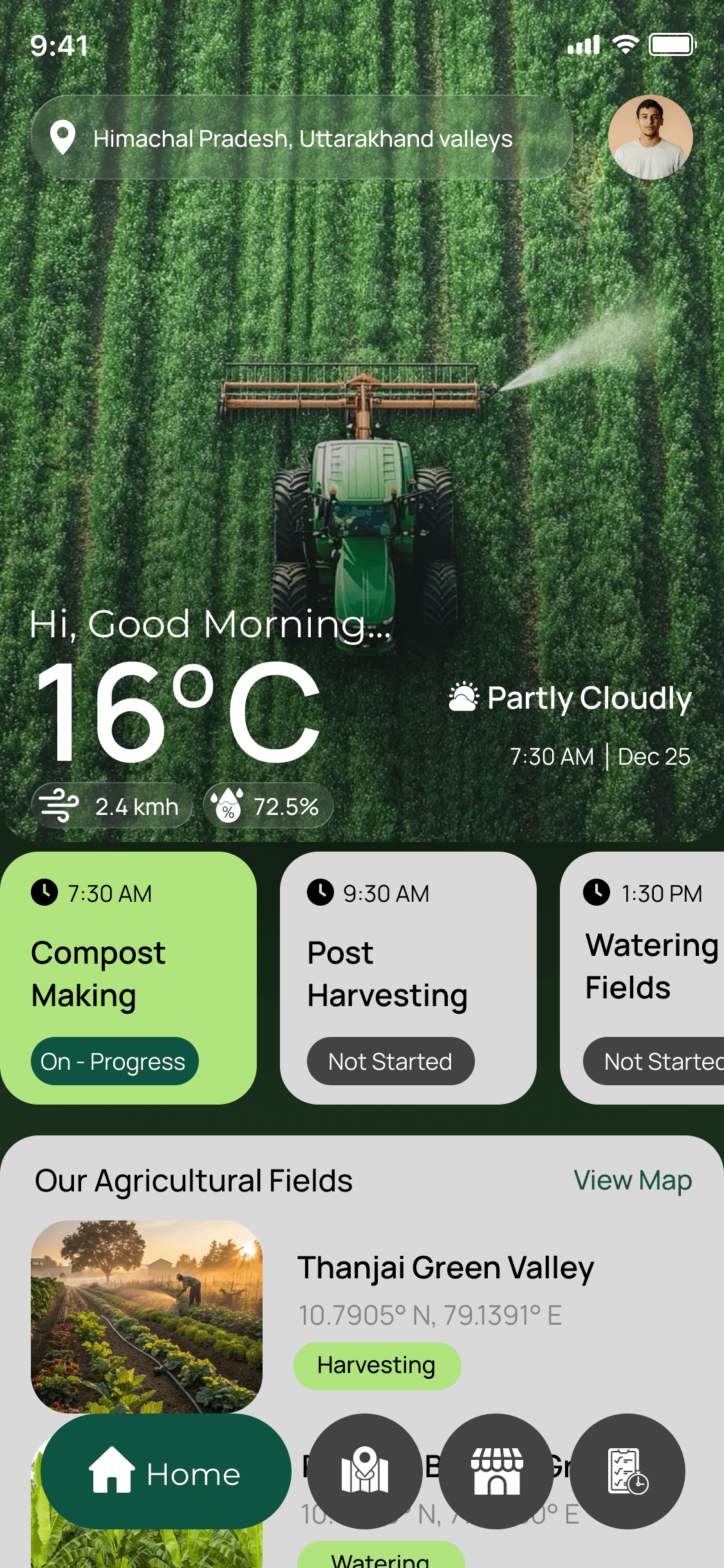 A mobile companion that brings drone-style live maps, weather data, task lists, and facility scanning to small and medium farmers in one glanceable, dark-mode-friendly interface.