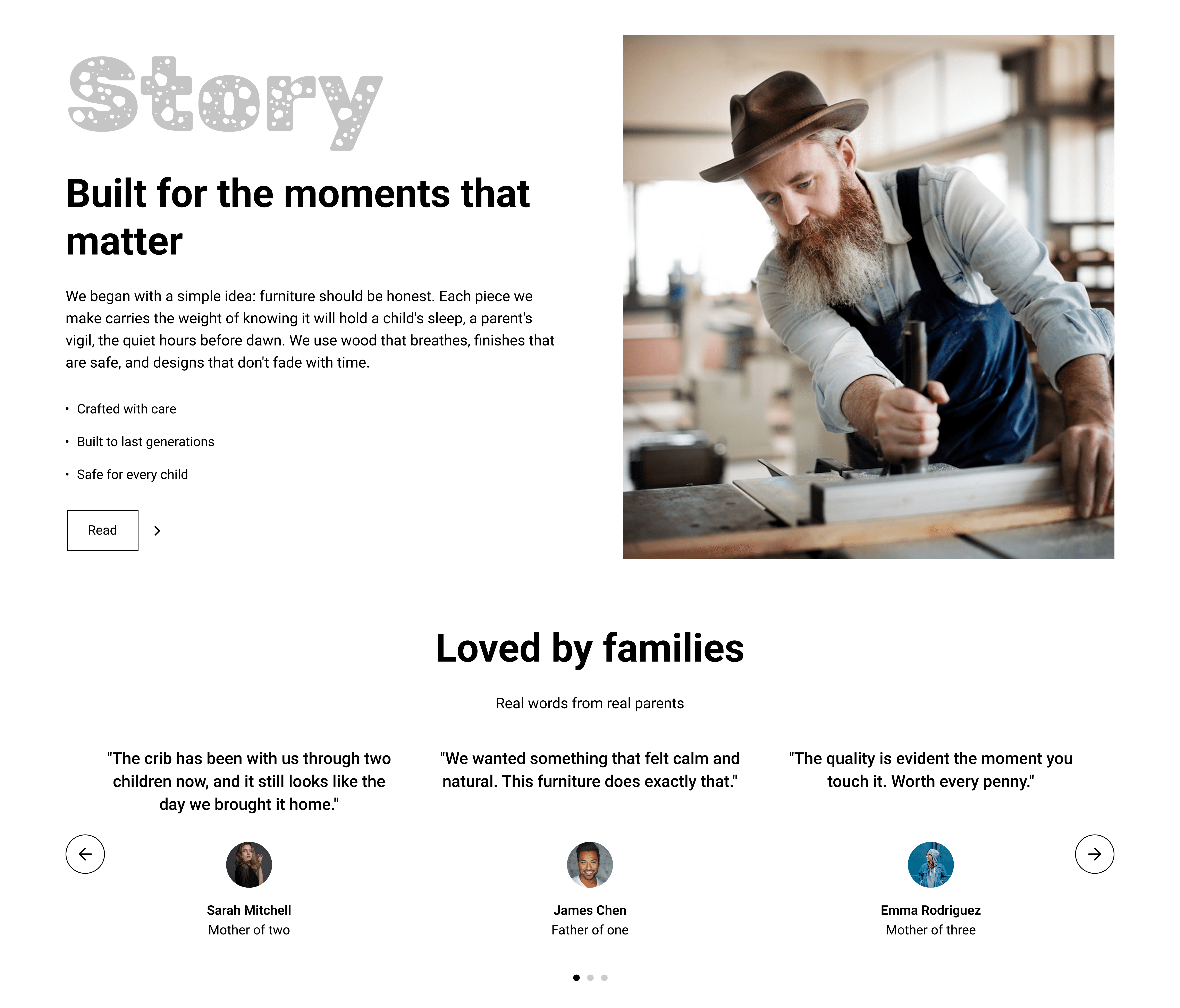 Text block: Story about craftsmanship, honest wood use, safety, longevity. Bullet points: Crafted with care, Built to last generations, Safe for every child.