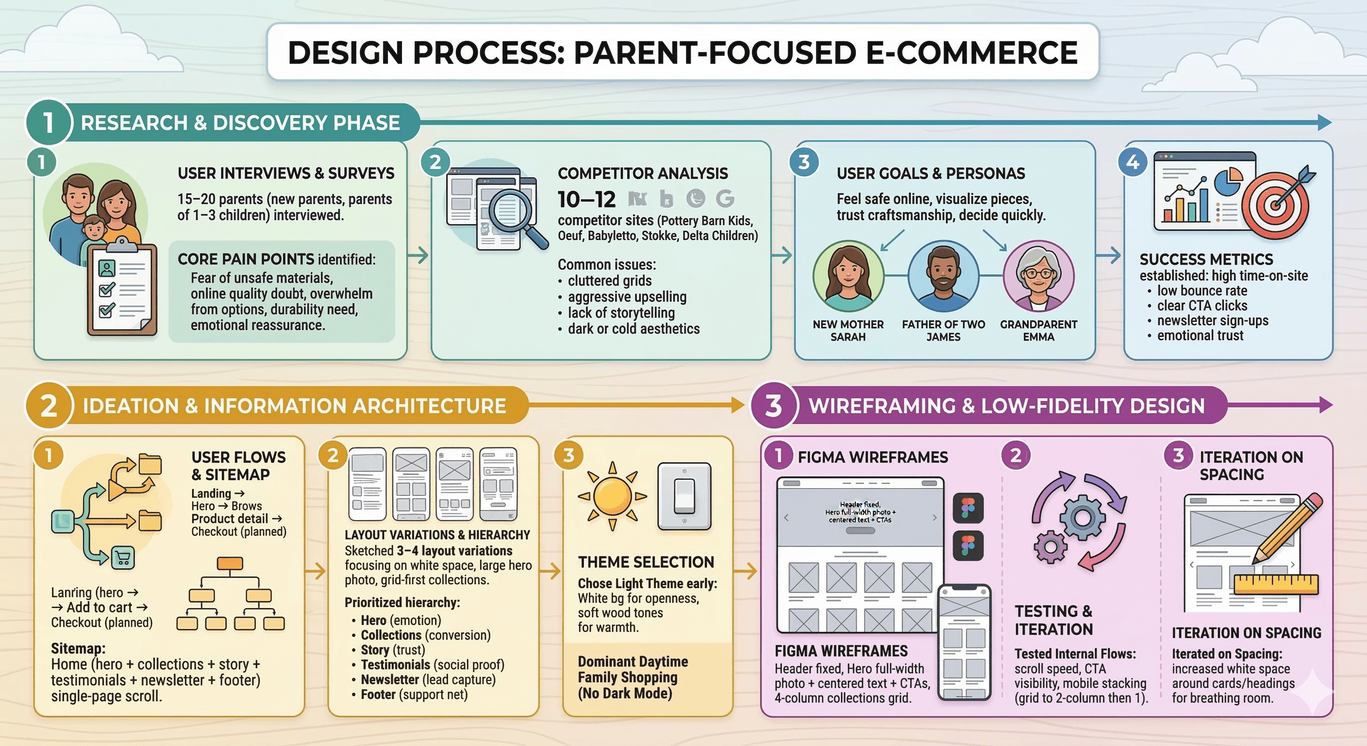 Conducted user interviews and surveys with 15–20 parents (new parents, parents of 1–3 children) to identify core pain points: fear of unsafe materials, doubt in online quality, overwhelm from too many options, need for long-term durability, and desire for emotional reassurance.