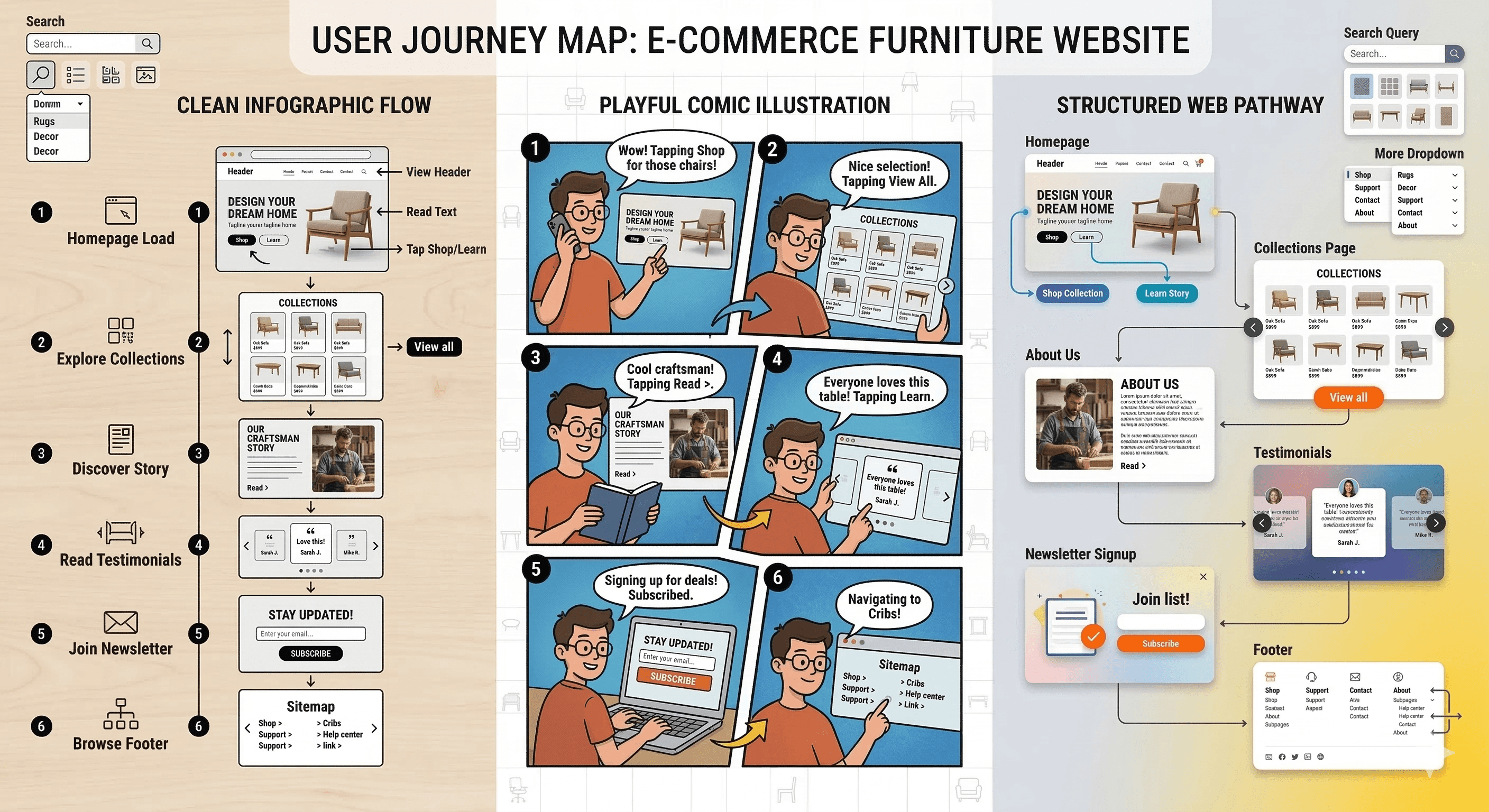 Defined key user goals: feel safe buying online, visualize pieces in real rooms, trust craftsmanship, decide quickly without guilt.