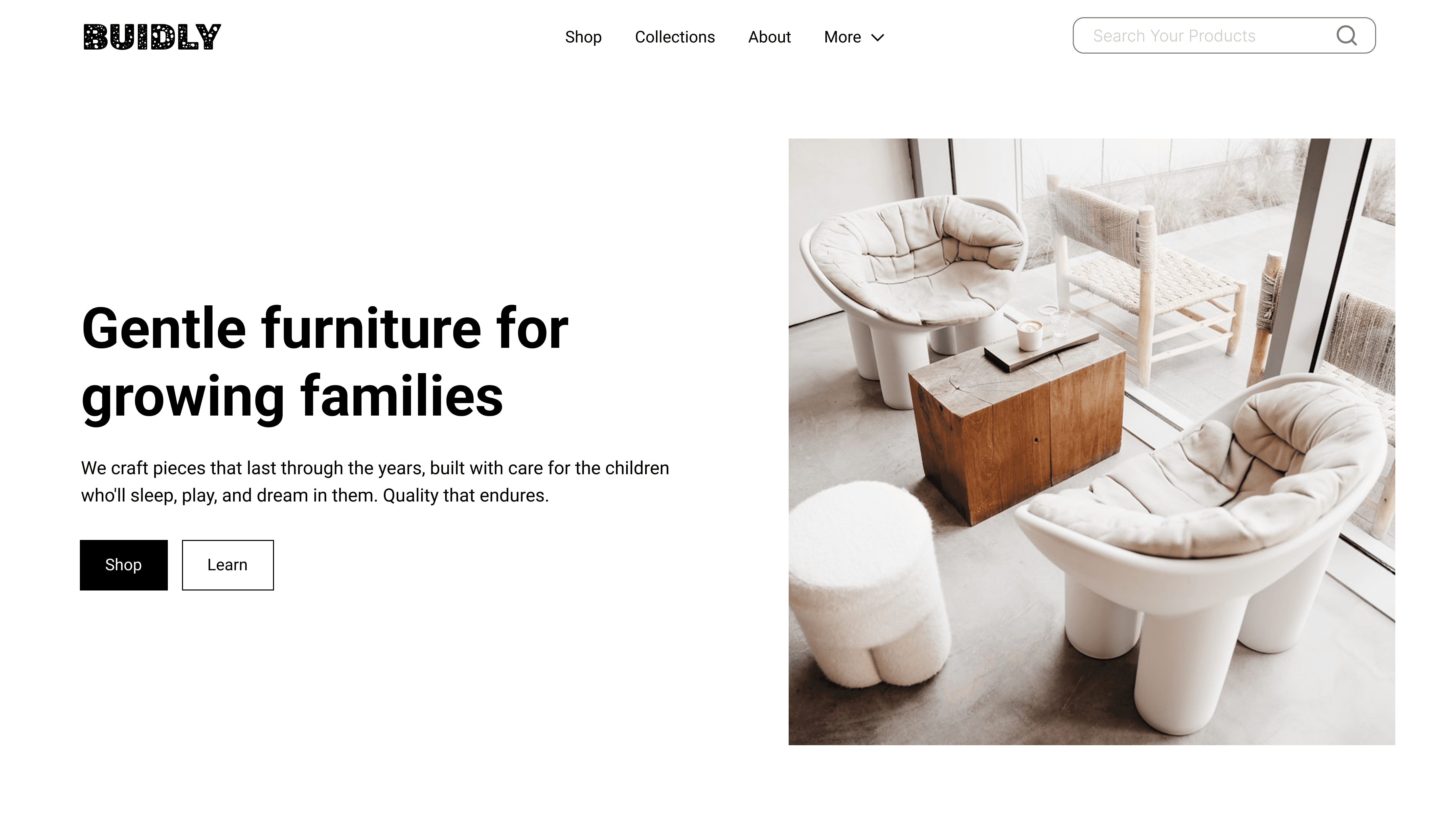 BUIDLY — a minimalist e-commerce site for child-safe, durable baby furniture. Clean layouts, real storytelling, and family-focused details make shopping feel reassuring and joyful.