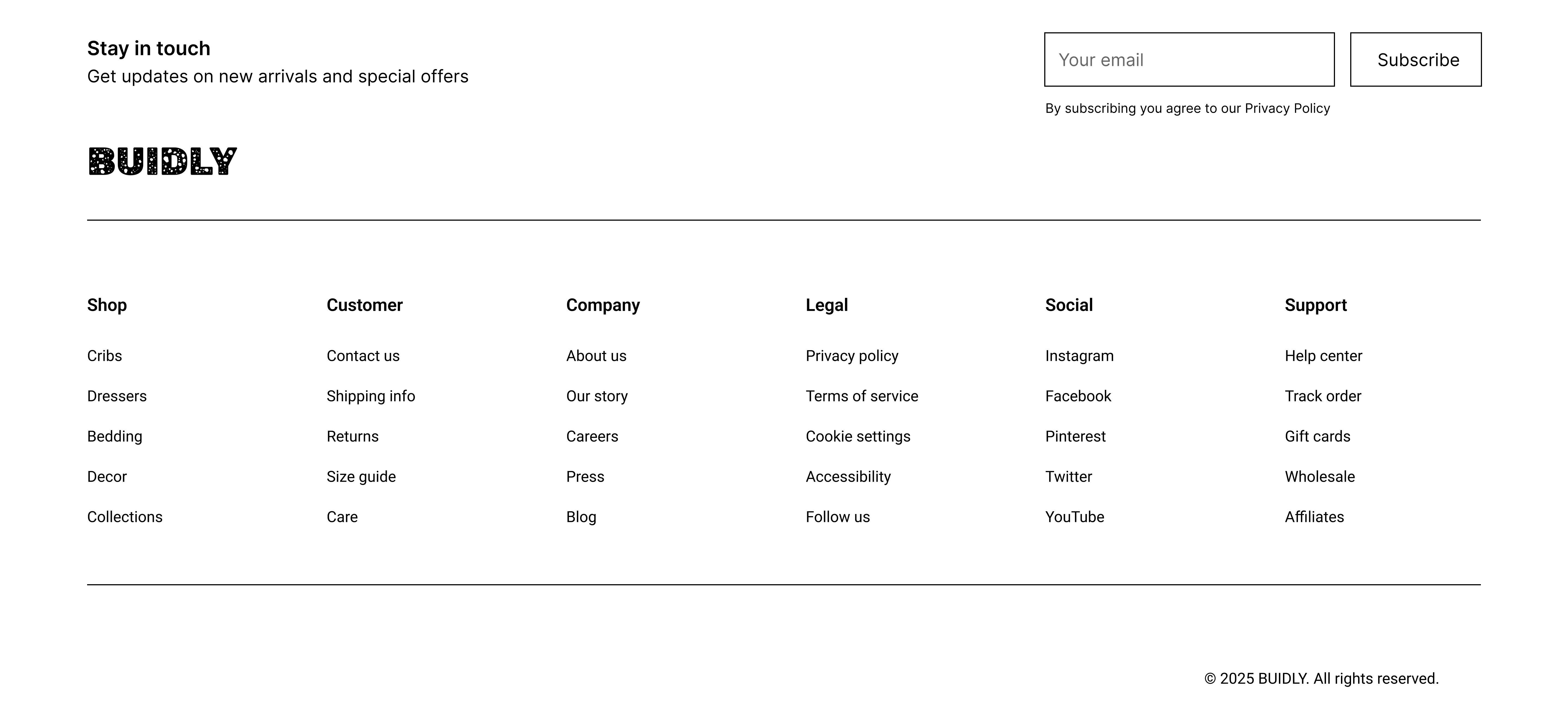 Design a multi-column footer with categorized links (Shop, Customer, Company, Legal, Social, Support) for comprehensive navigation and support.