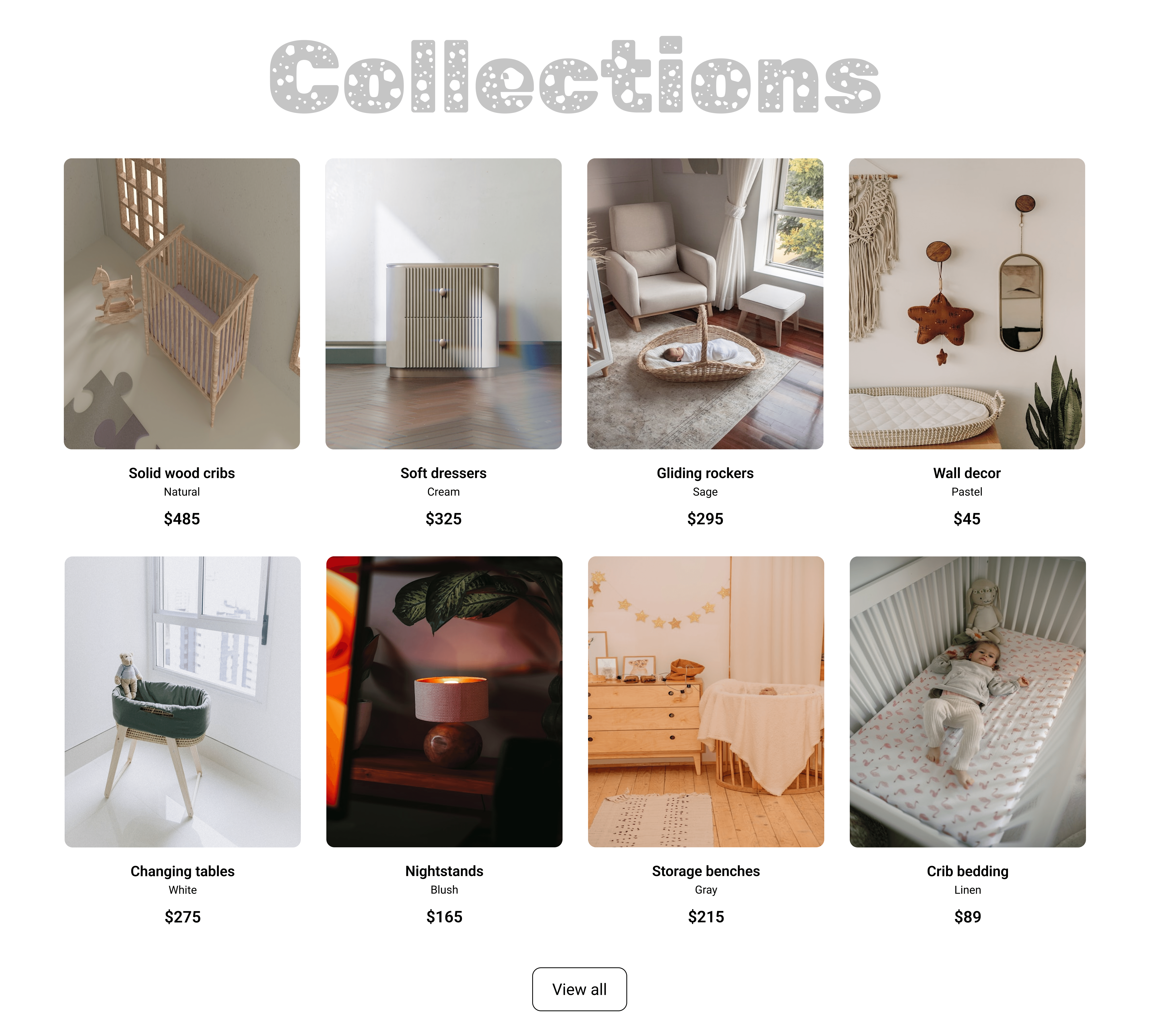 Organize collections in a responsive grid showcasing 8 key products with photos, names, prices, and "View all" link for quick browsing and discovery.