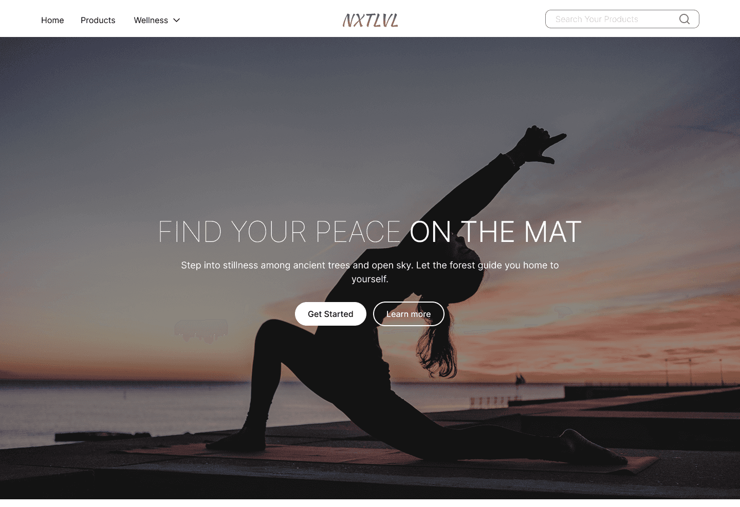 Design a hero banner with powerful tagline ("FIND YOUR PEACE ON THE MAT"), subtext on stillness and nature, and clear CTAs ("Get Started", "Learn more") to motivate immediate action.