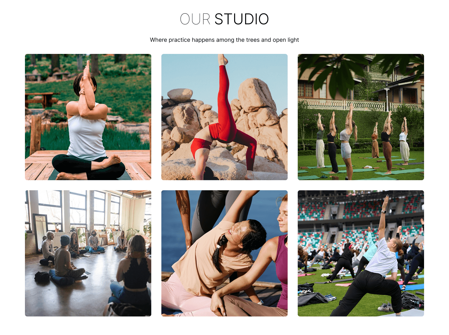 Include a "Our Studio" glimpse section with 6–9 high-resolution photos of yoga practice settings (forest, rocks, group classes) to show real-world environment.
