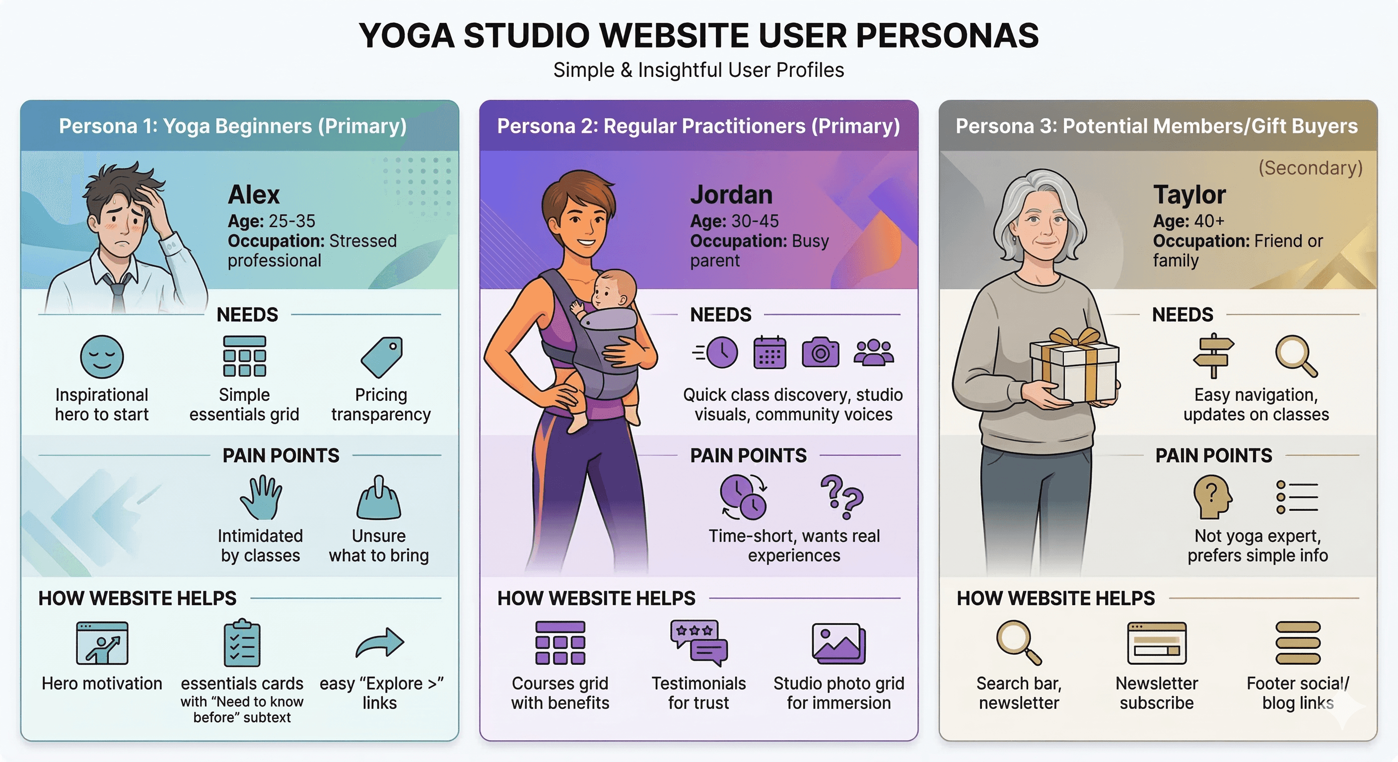 Persona 3: Potential Members/Gift Buyers (Secondary) – Name: Taylor, Age: 40+, Occupation: Friend or family. Needs: Easy navigation, updates on classes. Pain points: Not yoga expert, prefers simple info. How website helps: Search bar, newsletter subscribe, footer social/blog links.