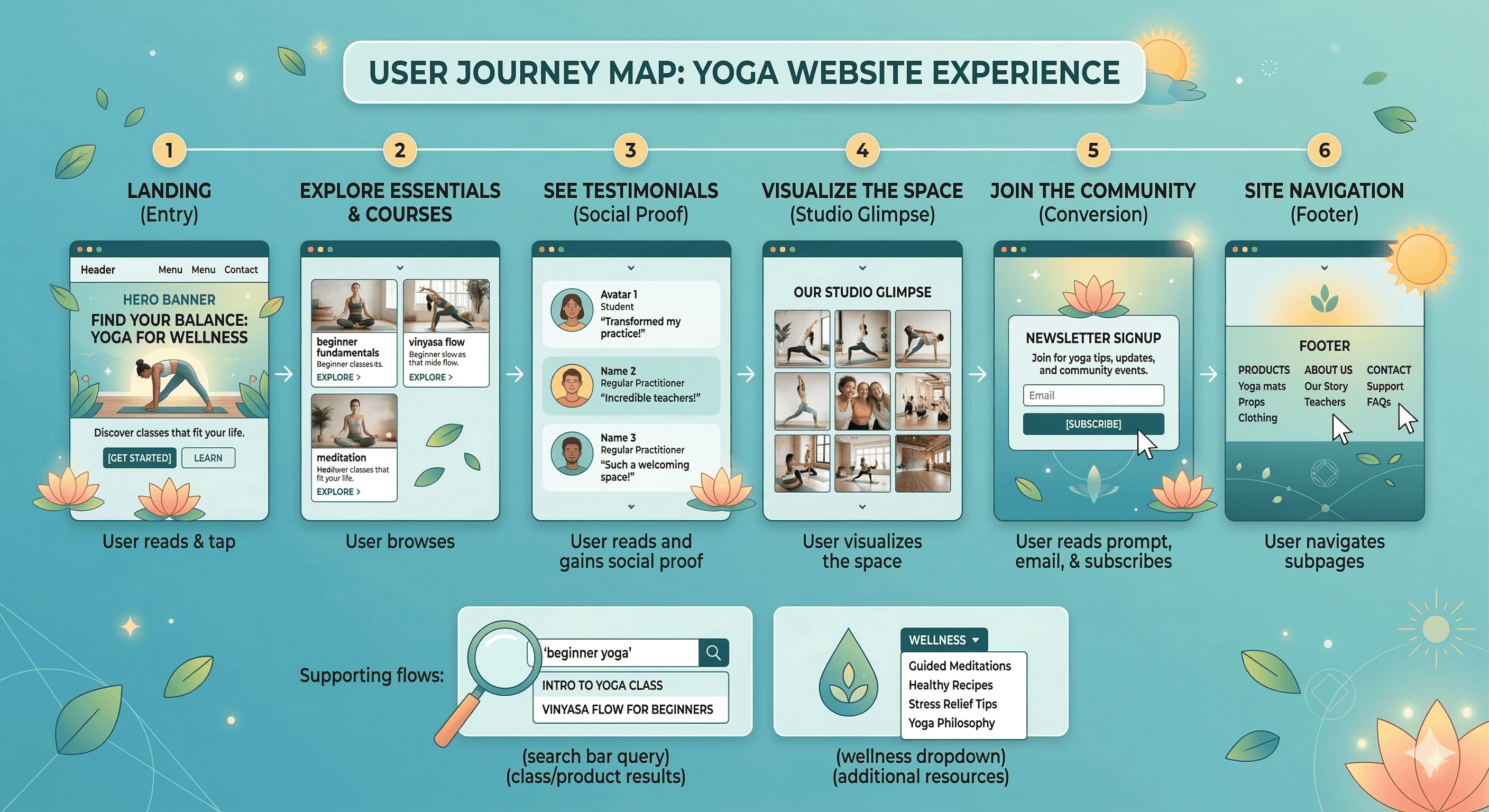 Defined core user flows: Landing → Hero → Essentials grid → Testimonials → Studio photos → Subscribe → Footer support.