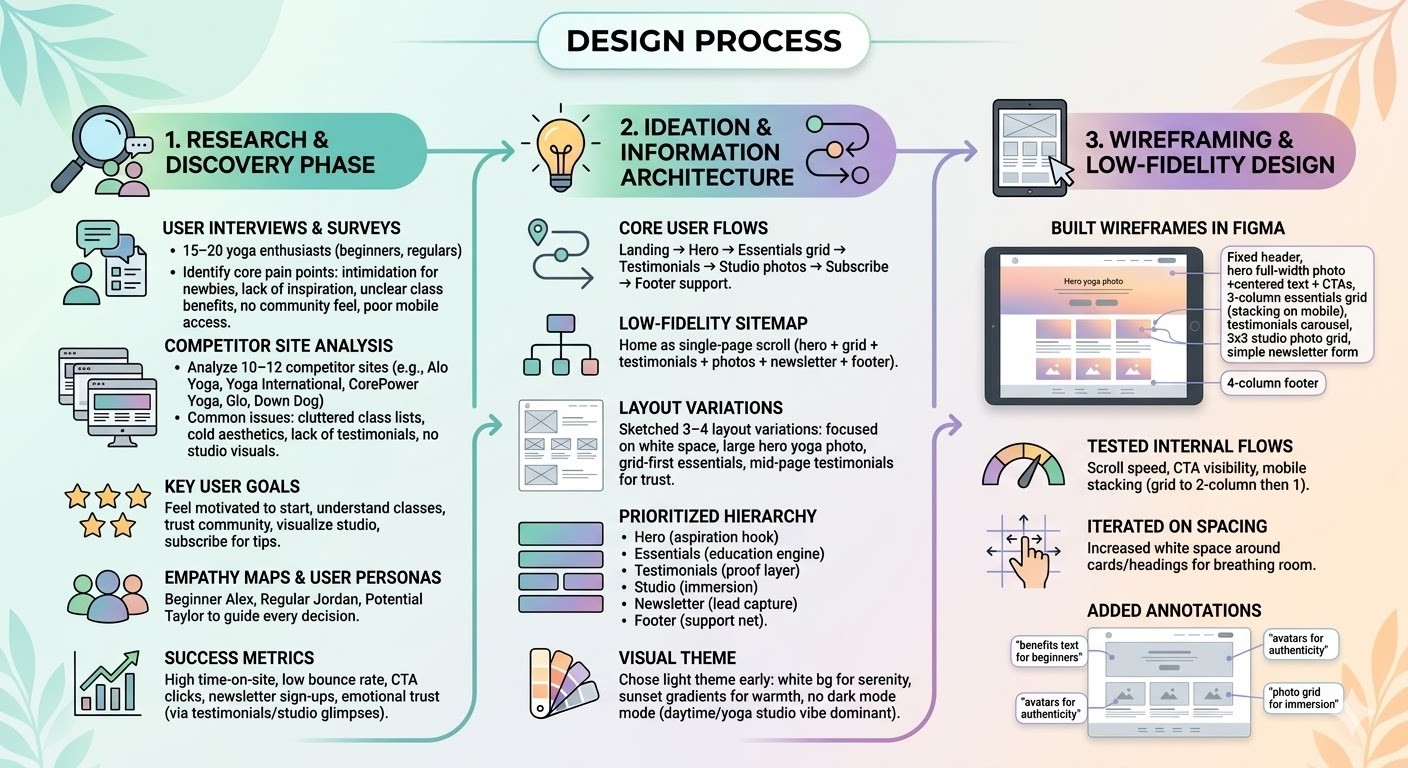 Analyzed 10–12 competitor sites (e.g., Alo Yoga, Yoga International, CorePower Yoga, Glo, Down Dog) → common issues: cluttered class lists, cold aesthetics, lack of testimonials, no studio visuals.