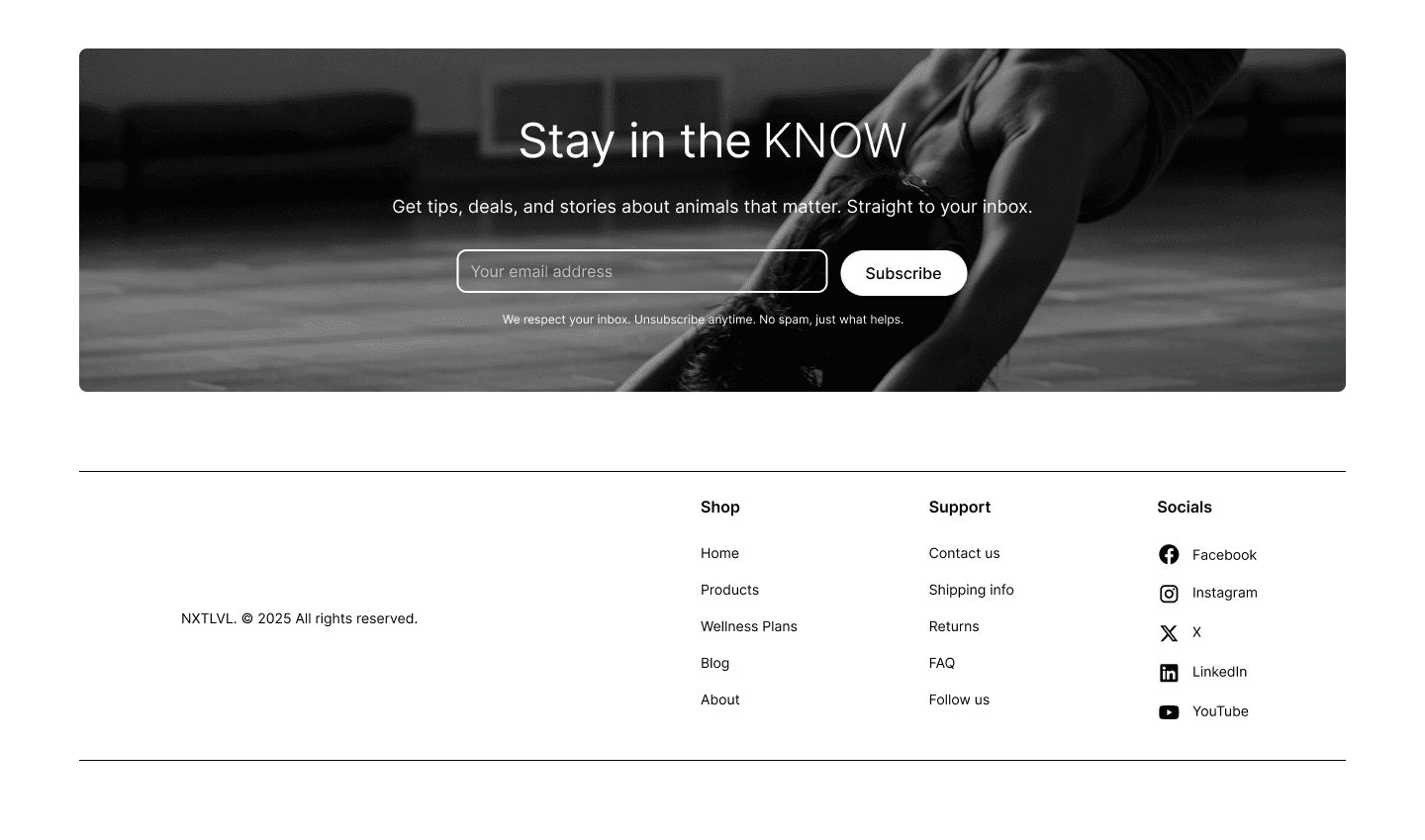 Footer: Columns – Shop (Home, Products, Wellness Plans, Blog, About), Support (Contact us, Shipping info, Returns, FAQ), Socials (Facebook, Instagram, X, LinkedIn, YouTube).