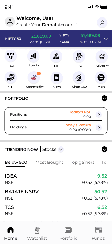 Header: Welcome "User" with avatar, Demat CTA "Create Your Demat Account!".