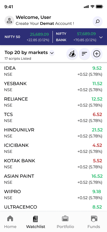 Purpose The Watchlist is the user's personal tracking hub — a place to save and monitor stocks, indices, or symbols they are interested in without cluttering the main dashboard or portfolio. It allows quick access to price changes, % gains/losses, and basic details for favorite assets, helping users stay updated on potential opportunities or risks without constant searching.