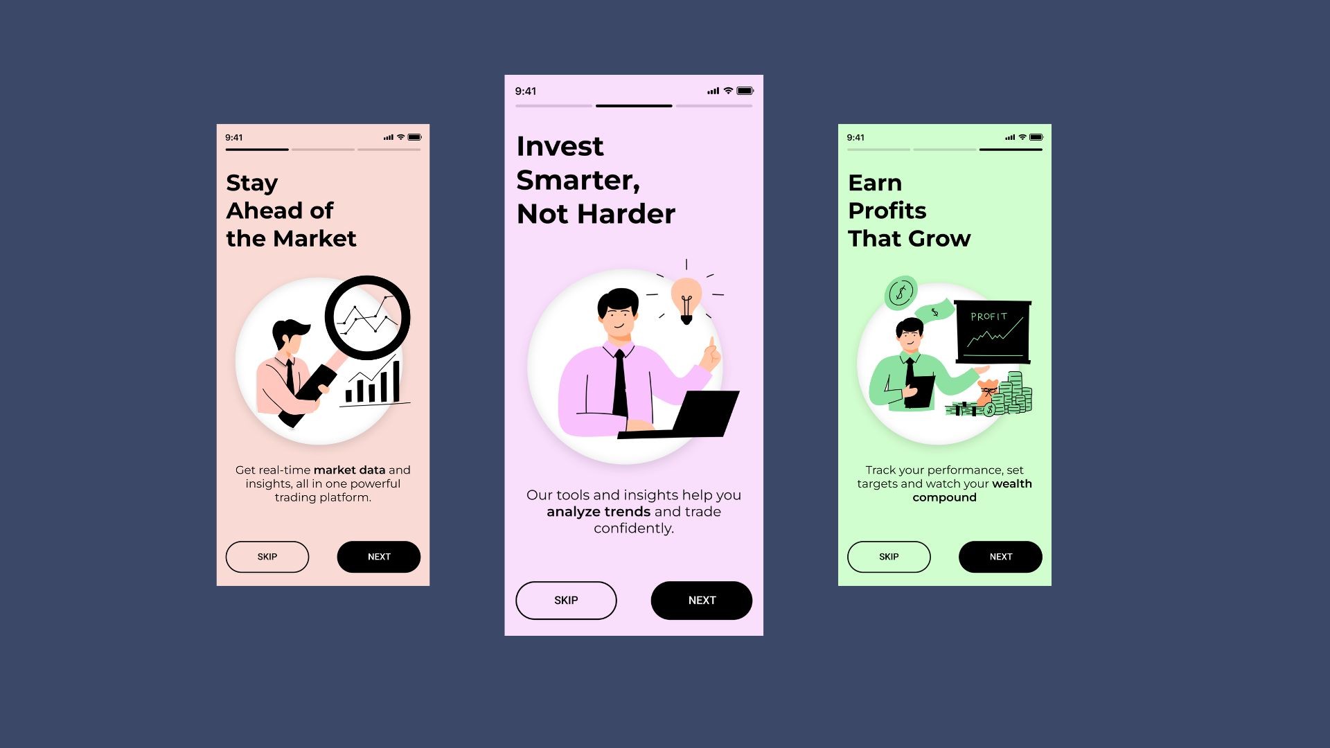The Trading and Investing App is a mobile UI/UX design aimed at simplifying stock market analysis, trading, and portfolio management for users in markets like India (e.g., NIFTY indices). It uses a light theme (white background with purple/blue accents for indices, green/red for gains/losses) for clean readability in well-lit environments, black text for contrast, and colorful illustrations (people with charts, lightbulbs, coins) to make onboarding motivational. Key screens include multiple onboarding slides ("Invest Smarter, Not Harder", "Earn Profits That Grow", "Stay Ahead of the Market") with SKIP/NEXT buttons, and a home/dashboard with welcome message, NIFTY values, category icons, portfolio summary, and trending stocks list. As a solo designer, I created this in Figma, focusing on real-time data display, motivational messaging, easy navigation, and accessibility for novice to intermediate investors.