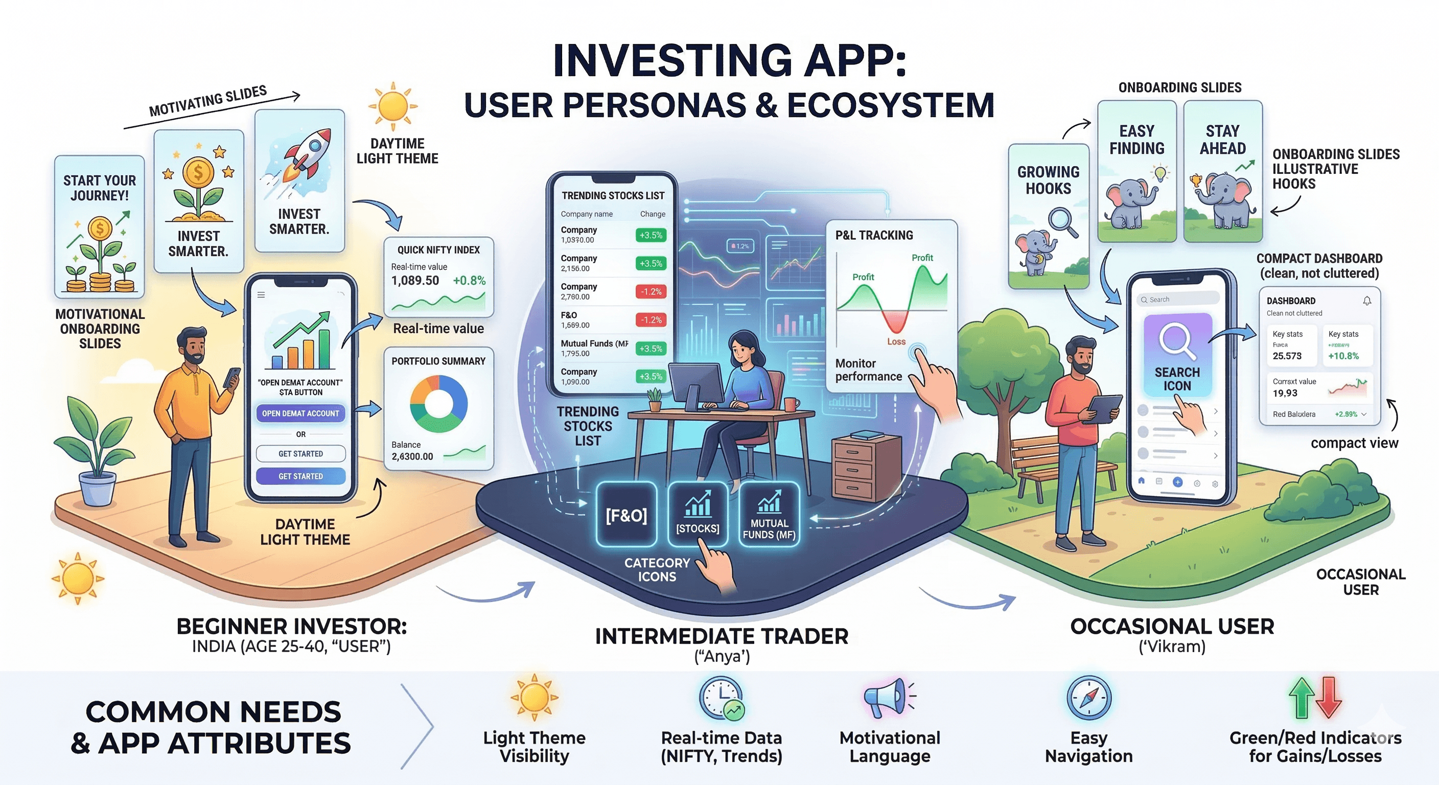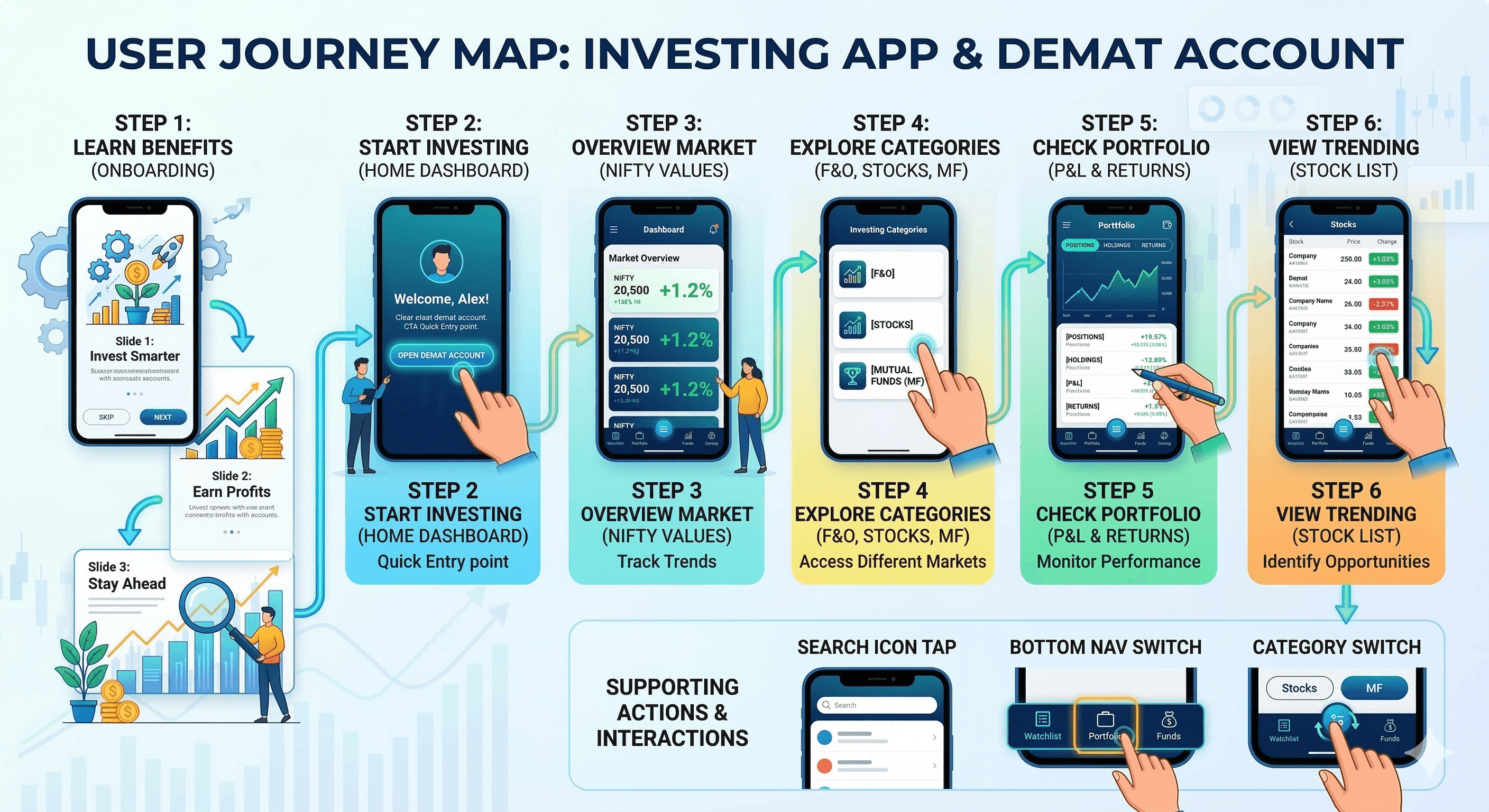 Many trading apps have overwhelming dashboards with too much data at once, dark themes that reduce visibility in daylight, impersonal welcomes, hidden performance tracking, and lack of motivational onboarding, leading to user confusion, low engagement, and high drop-off during initial setup. Users struggle with quick market overviews (e.g., NIFTY changes), category access (F&O, Stocks, MF), portfolio P&L visibility, and trending stock discovery without scrolling endlessly. This app addresses these by using light theme for clarity, immediate user welcome with Demat call-to-action, structured onboarding with illustrative hooks, prominent index values with % changes, icon-based categories, and compact trending lists with values/%.